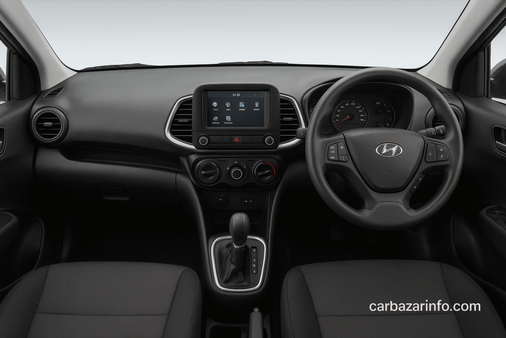 • Santro का डिज़ाइन practical और पारिवारिक है — ऊँचा सीटिंग पोज़िशन, सरल डैशबोर्ड और पर्याप्त हेड/लेग रूम। इंटीरियर में basic features अच्छे होते हैं; higher variants में टचस्क्रीन, बेहतर upholstery मिल सकती है।